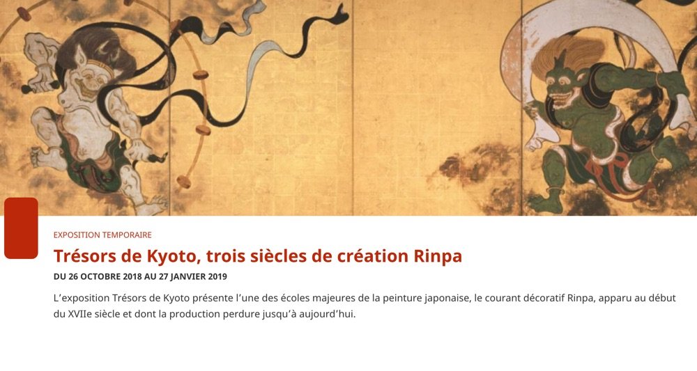 Un parcours chronologique en quatre parties, suivant les différentes générations d’artistes du mouvement Rinpa, permettra aux visiteurs de découvrir plus de soixante œuvres. Une scénographie soignée permettra de mettre à l’honneur l’éclat de la feuille d’or. L’exposition, qui rentre dans le cadre du 160° anniversaire des relations diplomatiques entre la France et le Japon, est en partenariat avec les Japonismes 2018 et elle est organisée conjointement par The Japan Foundation, le Musée national d’art moderne de Kyoto et le Musée Hosomi de Kyoto.