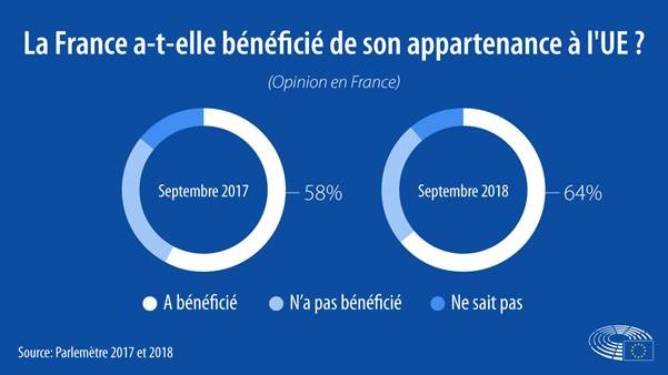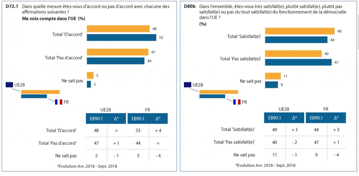Pour ce qui est de la France, en regardant attentivement cet Eurobaromètre, on note notamment que « 56% des Français ne sont pas satisfaits du fonctionnement démocratique de l’Union Européenne ». Dans le même temps, 53% des Français déclarent que «  leur voix compte dans l’UE ». L’étude précise que cette tendance est en hausse de 4 points. 61% des Français, selon cette étude, « considèrent que l’adhésion de leur pays à l’Union Européenne est une bonne chose ». Néanmoins, dans la question du bénéfice que la France a tiré de son entrée dans l’UE, la notion de démocratie arrive largement en dernière position dans les réponses.