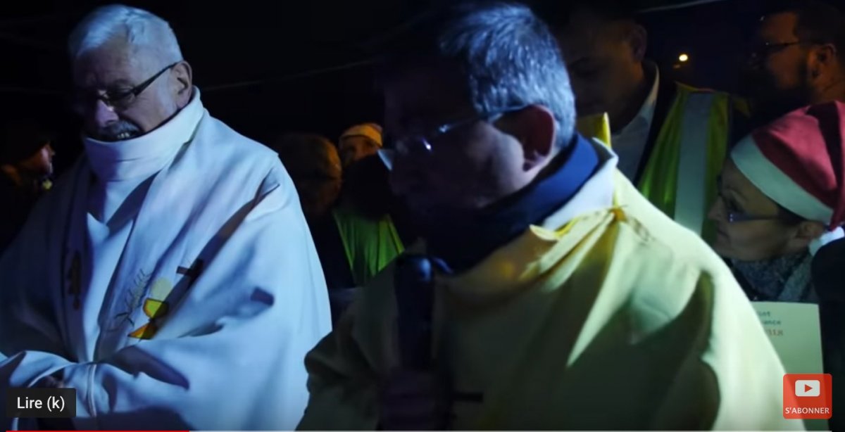 Un prêtre célèbre la messe de Noël sur un rond-point avec des Gilets Jaunes