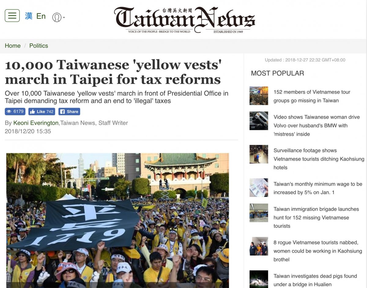 > À Taïwan, le 19 décembre dernier, des centaines de manifestants se sont regroupés devant le Palais Présidentiel à Tapei pour demander un allègement des taxes. Selon le Taïwan News près de 10 000 personnes auraient manifesté en portant un gilet jaune, inspirées par les Gilets Jaunes français.