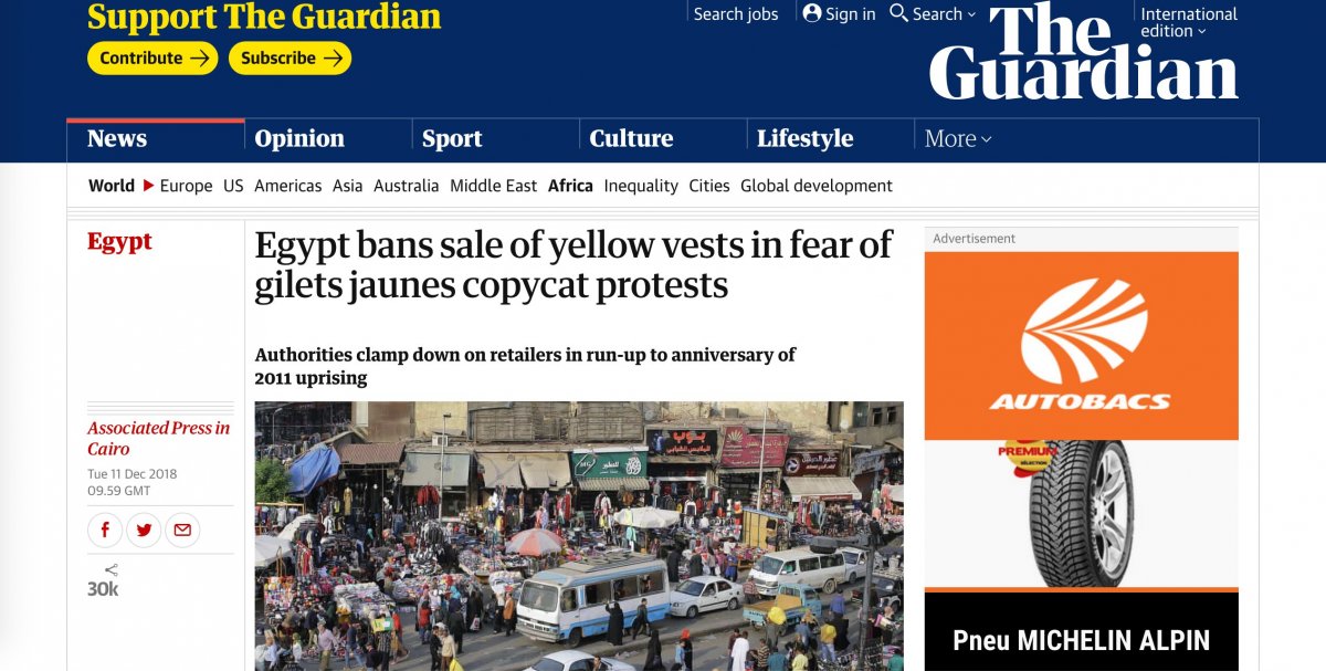 En Egypte, un avocat a été arrêté il y a quelques semaines après s’être photographié avec un Gilet Jaune en signe de soutien aux Gilets Jaunes français. Suite à cela, les autorités égyptiennes ont interdit la vente de Gilets Jaunes pour éviter la contagion selon nos confrères du Guardian!