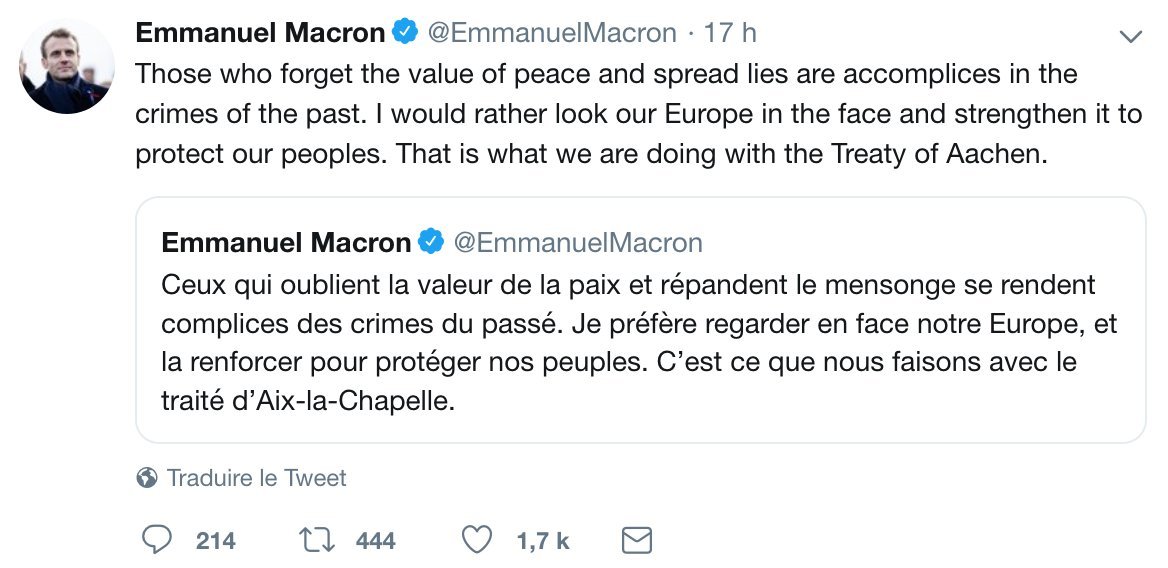 « Ceux qui oublient la valeur de la paix et répandent le mensonge se rendent complices des crimes du passé. Je préfère regarder en face notre Europe, et la renforcer pour protéger nos peuples. C’est ce que nous faisons avec le traité d’Aix-la-Chapelle »