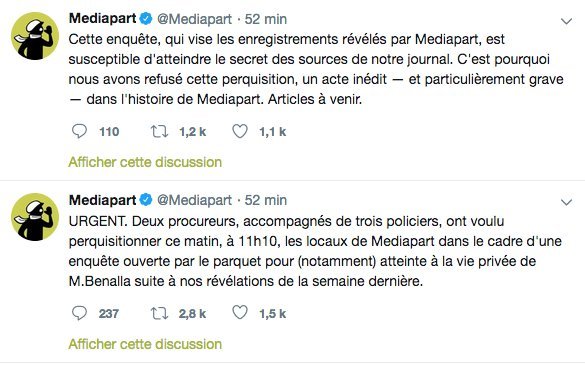 - Mediapart a déclaré ce matin sur son compte Twitter que « deux procureurs, accompagnés de trois policiers, ont voulu perquisitionner ce matin, à 11h10, les locaux de Mediapart dans le cadre d’une enquête ouverte par le parquet pour (notamment) atteinte à la vie privée de M.Benalla suite à nos révélations de la semaine dernière. »