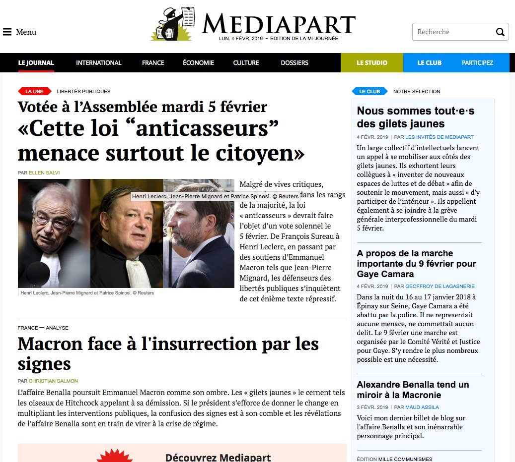 - Mediapart a déclaré ce matin sur son compte Twitter que « deux procureurs, accompagnés de trois policiers, ont voulu perquisitionner ce matin, à 11h10, les locaux de Mediapart dans le cadre d’une enquête ouverte par le parquet pour (notamment) atteinte à la vie privée de M.Benalla suite à nos révélations de la semaine dernière. »
