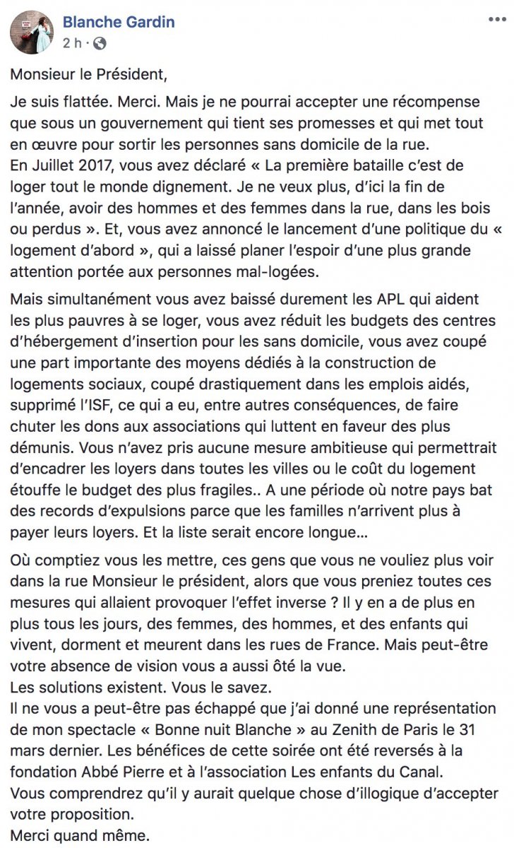 Dans un long post publié sur Facebook ( voir ci-dessous) elle a justifié son refus en expliquant que « je ne pourrai accepter une récompense que sous un gouvernement qui tient ses promesses et qui met tout en œuvre pour sortir les personnes sans domicile de la rue » Elle poursuit en critique ouvertement la politique du gouvernement : «Mais simultanément vous avez baissé durement les APL qui aident les plus pauvres à se loger, vous avez réduit les budgets des centres d’hébergement d’insertion pour les sans domicile, vous avez coupé une part importante des moyens dédiés à la construction de logements sociaux, coupé drastiquement dans les emplois aidés, supprimé l’ISF, ce qui a eu, entre autres conséquences, de faire chuter les dons aux associations qui luttent en faveur des plus démunis. Vous n’avez pris aucune mesure ambitieuse qui permettrait d’encadrer les loyers dans toutes les villes ou le coût du logement étouffe le budget des plus fragiles… »