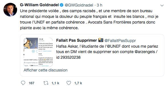 Le très médiatique avocat, Gilles William Goldnadel, président d’Avocats sans frontières, a condamné fermement ses tweets et a promis qu’Avocats Sans Frontières portera plainte très rapidement.