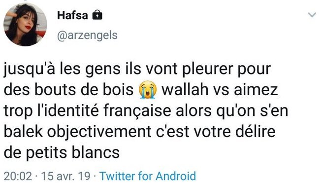 Peu avant, elle aurait récidivé avec cet autre tweet sans équivoque « « Les gens ils vont pleurer pour des bouts de bois. Wallah vous aimez trop l’identité française alors qu’on s’en balek objectivement c’est votre délire de petits blancs».