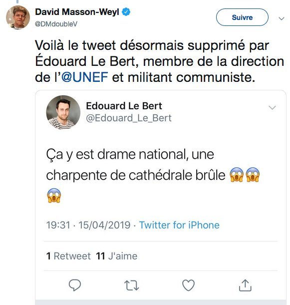Un autre représentant de l’Unef, Edouard Le Bert, présenté comme un membre au bureau national de l’Unef sur son compte twitter, aurait également publié de son côté toujours dans un tweet : « Ça y est drame national, une charpente de cathédrale brûle », a-t-il écrit. C’est un étudiant notamment de Sciences Po qui a repéré plusieurs de ces tweets. David Masson-Weyl s’est empressé de les signaler.