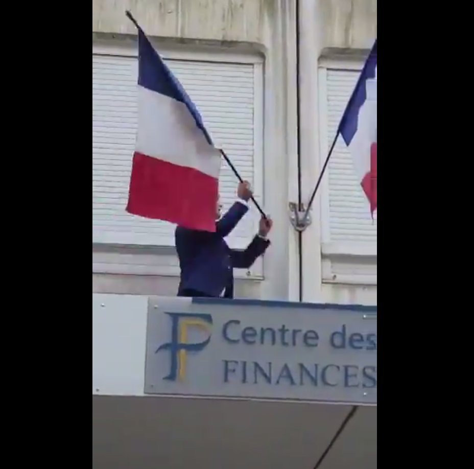 Florian Philippot, fondateur du parti politique, Les Patriotes, a grimpé au-dessus du fronton du Centre des Finances publiques de Forbach en ce 1er mai où il a remplacé le drapeau européen par un drapeau français.
