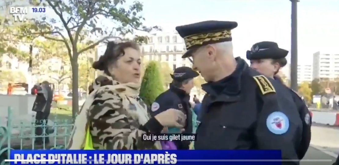 Le Préfet de police de Paris, Didier Lallement, était en visite après les affrontement avec des casseurs sur la place d’Italie à Paris pour l’acte 53 des Gilets Jaunes, ce samedi 16 novembre. Lors de son déplacement, il a croisé une dame se revendiquant des Gilets Jaunes.