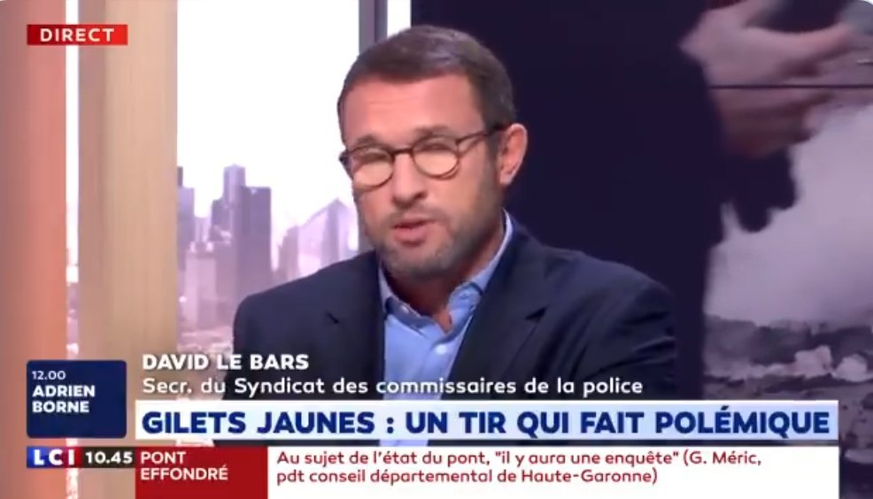 Suite à la grave blessure à l’oeil du Gilet Jaune ce samedi Place d’Italie, David le Bars, Secrétaire du Syndicat des commissaires de Police a déclaré sur le plateau de LCI que « cette grenade n’est pas forcément tirée par les forces de l’ordre. Si elle est ramassée, elle peut aussi être lancée par un individu qui n’est pas dans les forces de l’ordre mais a priori statistiquement on a plutôt des tirs faits par des policiers ou des gendarmes ».