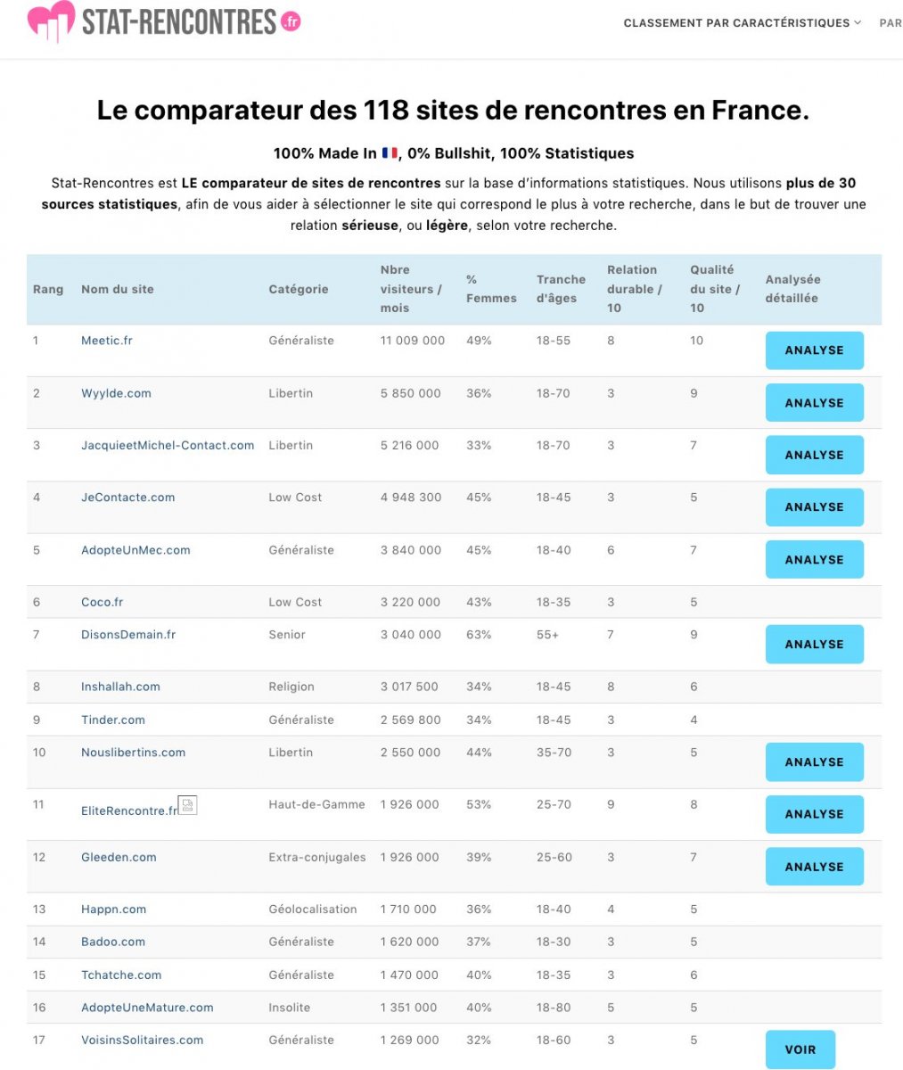 Il existerait en France près de 2000 sites actifs avec notamment ceux qui accaparent la plupart du marché comme Meetic, Adopte Un Mec, Tinde, Edarling ou encore AttractiveWorld. Certains ont fait le choix pour attirer une clientèle ciblée de définir des politiques d’acquisition ciblées et basées sur des critères sociaux, de genres ou encore d’orientations sexuelles.