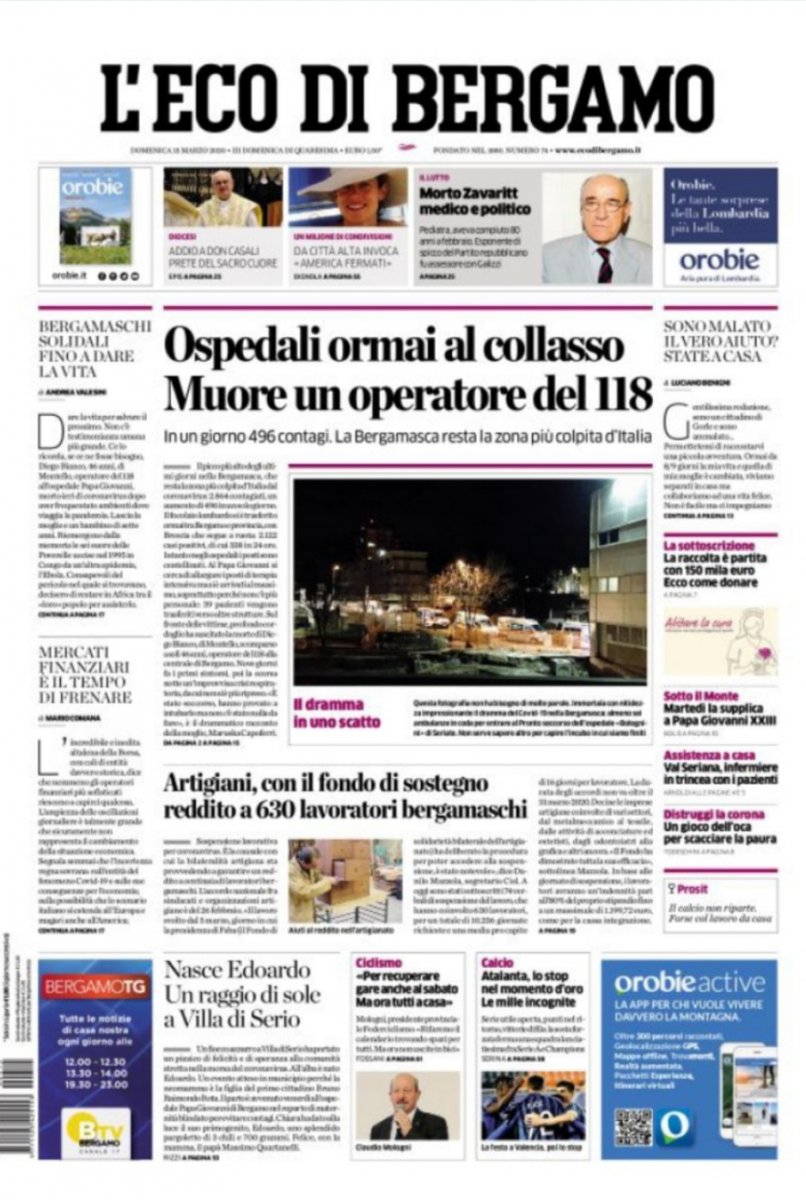 La une du 15 mars 2020 du quotidien local Italien « L’Eco di Bergamo ». Copyright L’Eco di Bergamo)