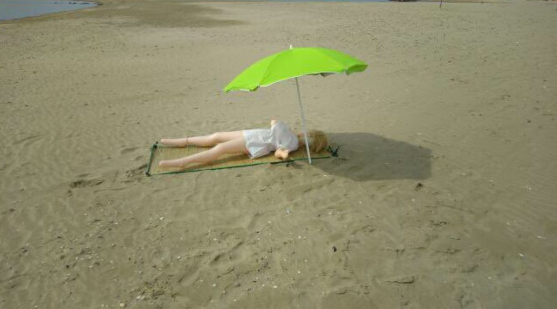 Alors que l’un deux s’approche pour verbaliser une femme sur la plage, il découvre que c’est en réalité une poupée gonflable posée sous un parasol.
