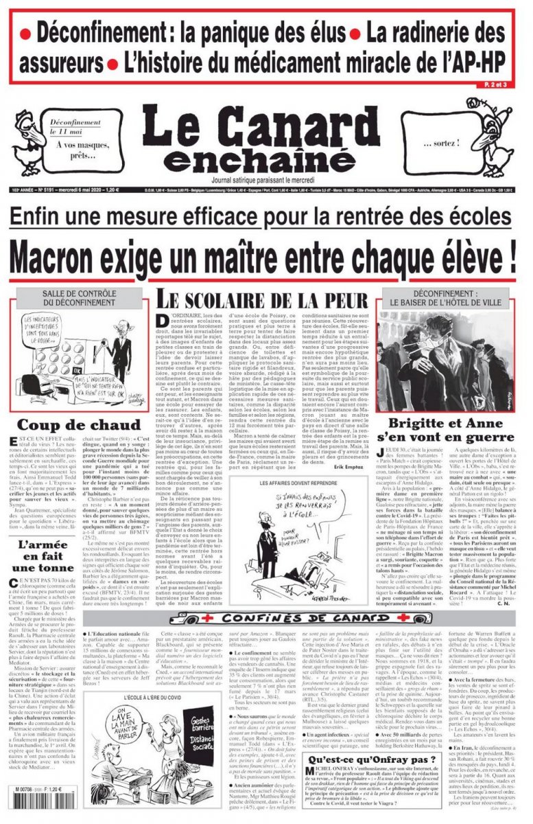 Le Canard Enchaîne rapporte que « quand sont parvenues à Paris les informations relatives à l’apparition d’un nouveau virus, il était encore possible, pour un président conscient de ses responsabilités, de constituer un bon stock de masques, de tests et de respirateurs. Mais Macron n’a pas trouvé le temps d’y penser ».