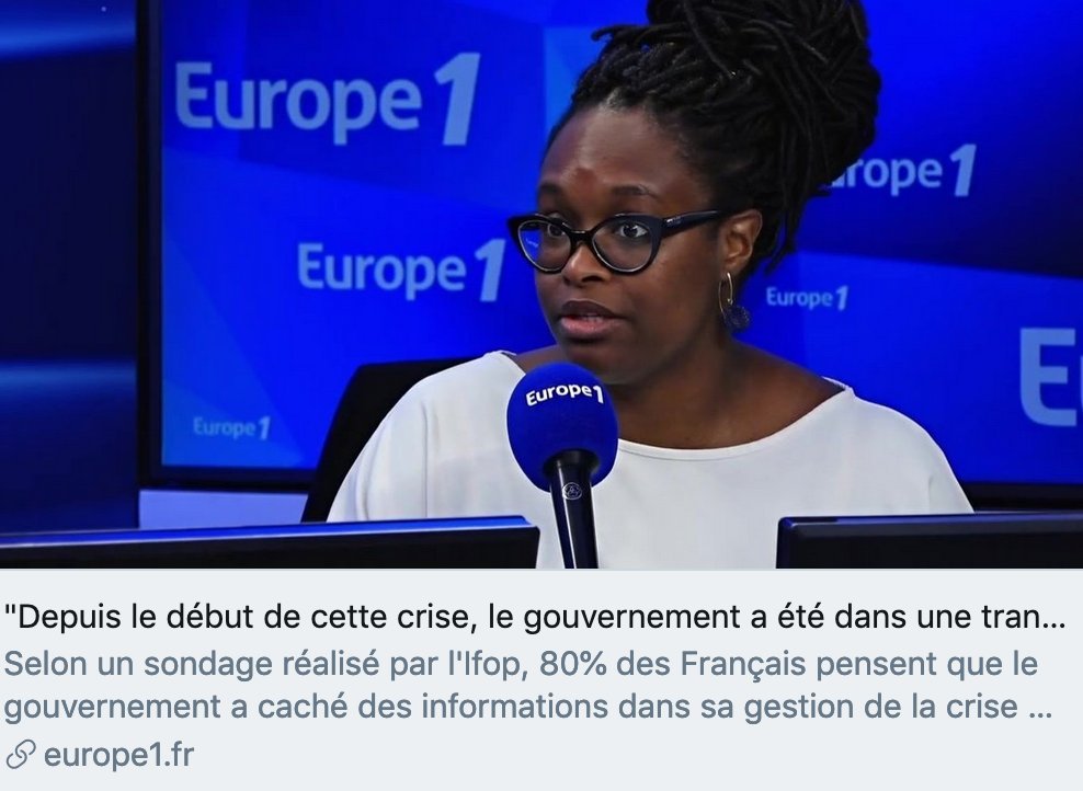 Alors que Sonia Mabrouck lui demandait de réagir sur le sondage réalisé par l’ifop qui laisse transparaître que 80 % des Français «pensent que le gouvernement a caché des informations dans sa gestion de la crise du coronavirus ». Ce à quoi Sibeth Ndiaye a répondu qu’ « elle le regrettait mais depuis le début de cette crise, le gouvernement a été dans une transparence totale « .