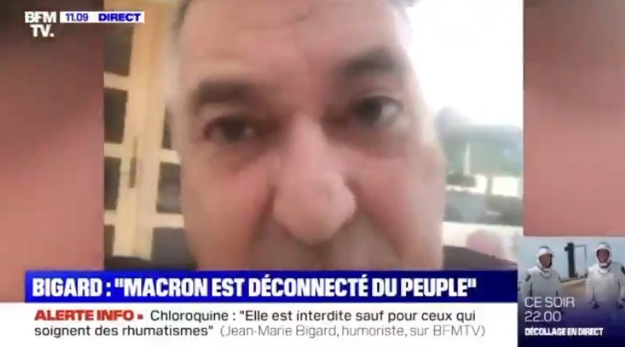 BFM n’a pas tardé à réagir en invitant en duplex Jean-Marie Bigard, qui, fidèle à lui -même a répondu aux questions du présentateur avec un franc-parler inénarrable sur une éventuelle candidature à la Présidentielle, l’utilisation de l’hydroxychloroquine et sur son rôle de porte-voix du « peuple ».