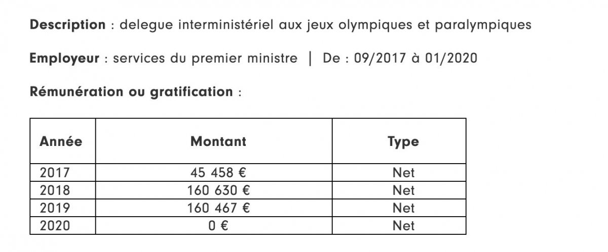 Pour information, Jean Castex a déclaré une rémunération entre septembre 2017 et janvier 2020, de près de 366000 euros nets par an en tant que délégué interministériel aux jeux olympiques et paralympiques .