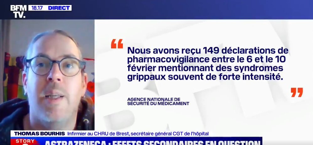 Thomas Bourhis, infirmer au CHRU de Brest et secrétaire CGT de l’hôpital était l’invité de BFM TV suite à une vague d’effets secondaires après l’injection du vaccin AstraZeneca chez le personnel soignant au sein l’établissement de Brest.
