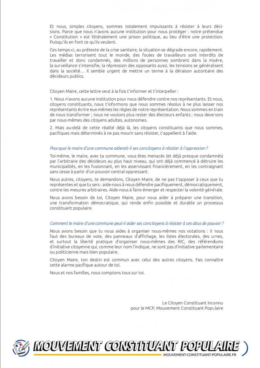 Le 13 février dernier, le MCP a rédigé une lettre à l’attention des maires de France en utilisant le tutoiement et la mention de « citoyen» pour demander aux édiles locaux de leur mettre à disposition les installations de la mairie pour organiser des élections. La lettre d’un citoyen à un citoyen maire a été publiée sur la page facebook du MCP.