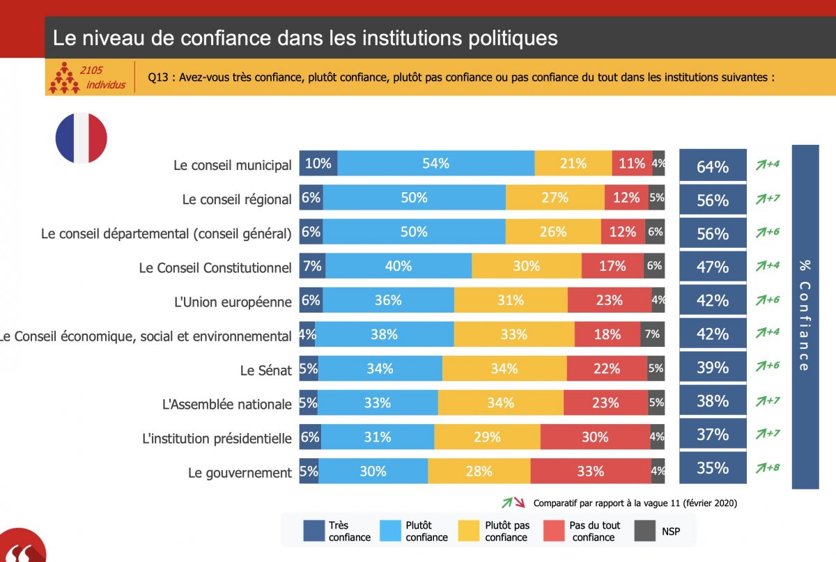 Avec une hausse de 4 points par rapport à l’année précédente, 64 % des participants ont une opinion « favorable » du conseil municipal. 39 % d’opinions sont « confiantes » pour le Sénat, et 38 % le sont pour l’Assemblée nationale. 65 % des Français ont une plus grande confiance en leur maire, contre 37 % envers le président de la République. 34 % sont par ailleurs plus loyaux envers le Premier ministre. Enfin, près de 65 % pensent que leurs dirigeants et élus sont « plutôt corrompus ».