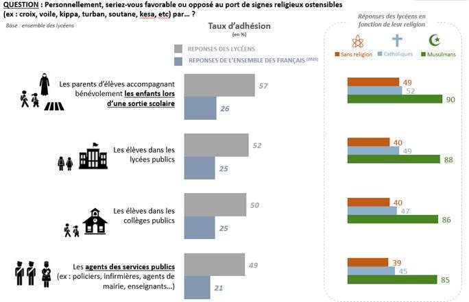 Le port du voile, de la kippa, la croix, la soutane … ne gênerait plus la majorité des lycéens. Cette enquête révèle en effet que 52% des élèves des lycées publics y sont favorables. Ce pourcentage était pourtant beaucoup moins élevé, il y a une quinzaine d’années selon l’enquête de l’époque (2006-2009). Celle-ci soulignait, en son temps, un rejet allant jusqu’à 58%. Toutefois l’avis de l’ensemble des Français demeure mitigé, car seuls 26% d’entre eux sont pour le port d’un symbole religieux.