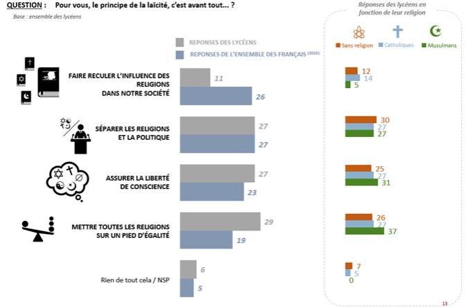 L’enquête questionne le rôle de la laïcité consistant à diminuer l’influence sociale des religions. Les lycéens ont principalement répondu non à cette partie de l’étude. 11% d’entre eux adhèrent cependant à cette idée. Par ailleurs, ils sont 29% à juger la laïcité nécessaire pour que les religions soient traitées sur un pied d’égalité. Cette même frange de la population considère la laïcité comme un moyen d’éviter une confusion entre religions et politique.
