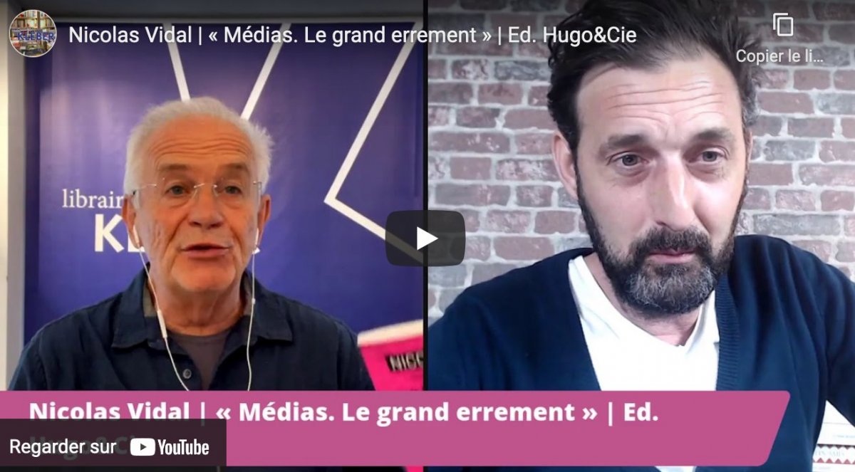 Jeune entrepreneur média, Nicolas Vidal lance, en 2008, BSC NEWS, le premier webmagazine culturel en France. Il récidive en 2018, en pleine crise de la presse, en lançant un nouveau webmédia en France, PUTSCH, qui cherche à favoriser les débats culturels et sociétaux tout en stimulant la diversité des points de vue. Il sera en Live Facebook et Youtube pour nous présenter son ouvrage « Médias : Le grand errement » paru aux Éditions Hugo&Cie. Nicolas Vidal cherche à analyser la raison d’être de la défiance d’une grande partie des Français à l’égard des médias dans leur ensemble. Il cherche à évaluer le déficit de côte d’amour ou de crédibilité des supports d’information qui constitue un symptôme inquiétant pour la démocratie. Il constate la désagrégation des contenus de qualité, la perte de sens qui entraîne la désaffection des lecteurs. Les récents conflits sociaux (Gilets jaunes, réforme des retraites) et la crise sanitaire révèlent des antagonismes très forts entre la grande presse nationale parisienne et la France des territoires. Certains médias auraient-ils succombé aux sirènes de l’entre-soi, laissant à l’écart de l’information une grande partie des Français ? Faut-il aller jusqu’à incriminer une presse dogmatique et doctrinaire, en proie aux idéologies, et qui se serait déconnectée d’une France périphérique qu’elle aurait méprisée ? Nicolas Vidal cherche à décrypter ce grand errement et mettre en garde contre ses conséquences (Source Librairie Kléber)