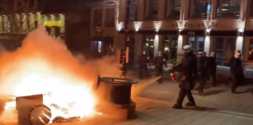 Feux d’artifice, slogans, et des « Libertés » qui ont résonné dans ce coin très touristique de Montréal. Mais alors que la manifestation se tenait, des individus ont semé le trouble en mettant le feu à des poubelles. À l’arrivée des policiers ( Service de police de la Ville de Montréal) la foule s’est dispersée dans les ruelles du Vieux-Montréal.