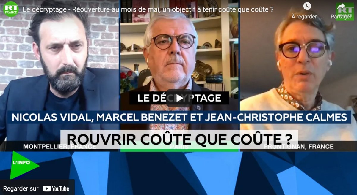 Nicolas Vidal, fondateur de Putsch.media & éditorialiste sur RT France, Marcel Benezet, président de la branche des cafés, bars et brasseries du syndicat GNI et Jean-Christophe Calmes, médecin, vice-président du syndicat MG France, étaient invités à revenir sur la levée progressive des restrictions prévue pour le mois de mai. Le gouvernement français par la voix de son porte-parole Gabriel Attal a confirmé la levée le 2 mai de l’interdiction de s’éloigner de plus de 10 kilomètres de son domicile, d’alléger le couvre-feu et de rouvrir à partir de mi-mai les terrasses, commerces non alimentaires et lieux culturels, avec des jauges réduites ( Source RT France)