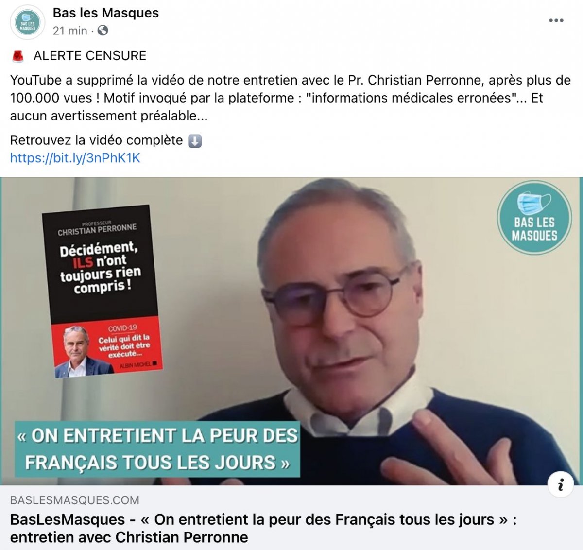 Bas les Masques a déploré cette suppression par ce communiqué : « YouTube a supprimé la vidéo de notre entretien avec le Pr. Christian Perronne, après plus de 100.000 vues ! Motif invoqué par la plateforme : « informations médicales erronées »… Et aucun avertissement préalable…