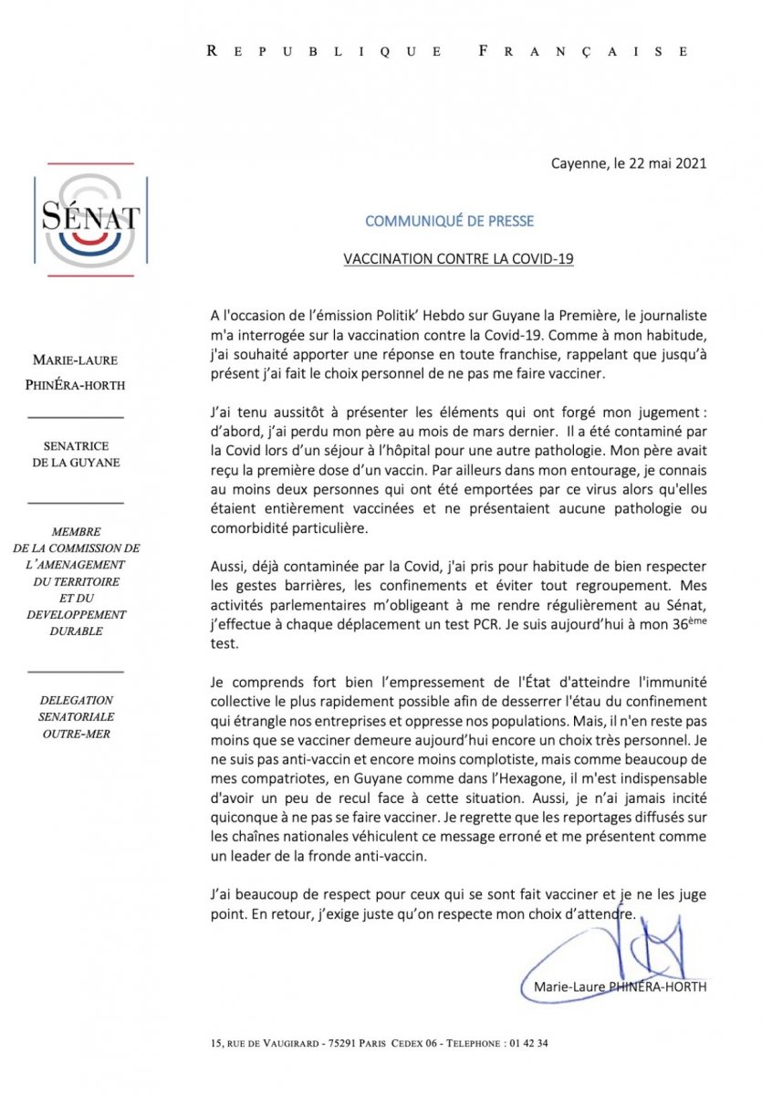 Madame Phinera-Hort, sénatrice de la Guyane, membre de la commission de l’aménagement du territoire et du développement durable a donné sa position sur la vaccination lors d’un entretien sur la chaîne Guyane La Première dans l’émission Politik’Hebdo.