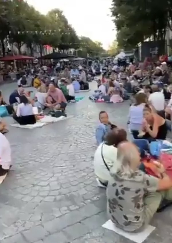 Cette vidéo nous vient de Reims où plusieurs dizaines de citoyens ont choisi d’organiser un pique-nique improvisé dans une rue de la ville pour protester contre le Pass sanitaire. Sur la vidéo, on peut apercevoir quelques terrasses désespérément vide. Dans une ambiance bon enfant et chaleureuse, les gens ont opté pour contester dans la bonne humeur l’imposition du Pass sanitaire qui leur interdit notamment l’accès aux cafés et aux restaurants pour attendre les manifestations de ce samedi.