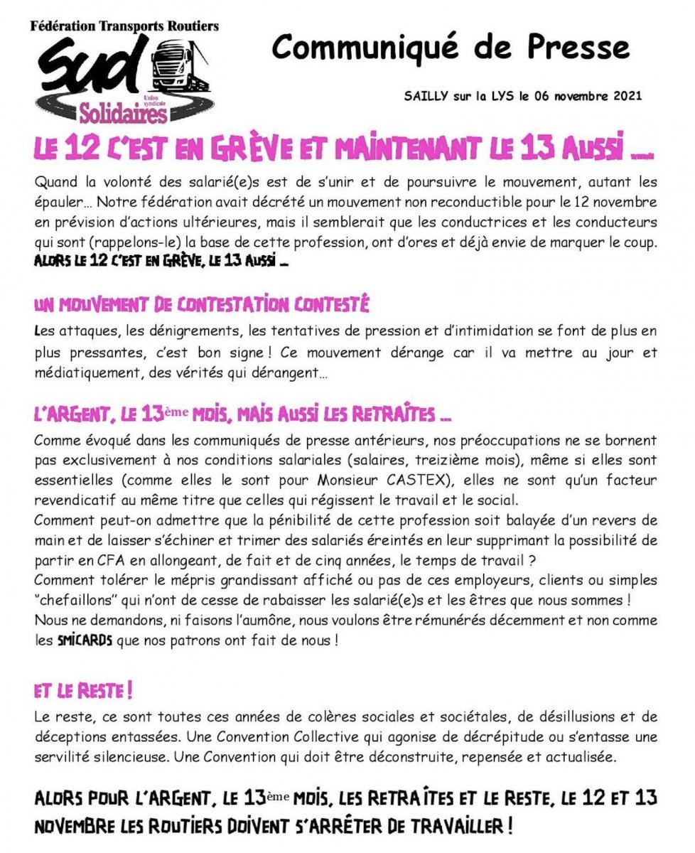 — Fédération SUD-SOLIDAIRES des Transports Routiers (@SudRoutiers) November 6, 2021