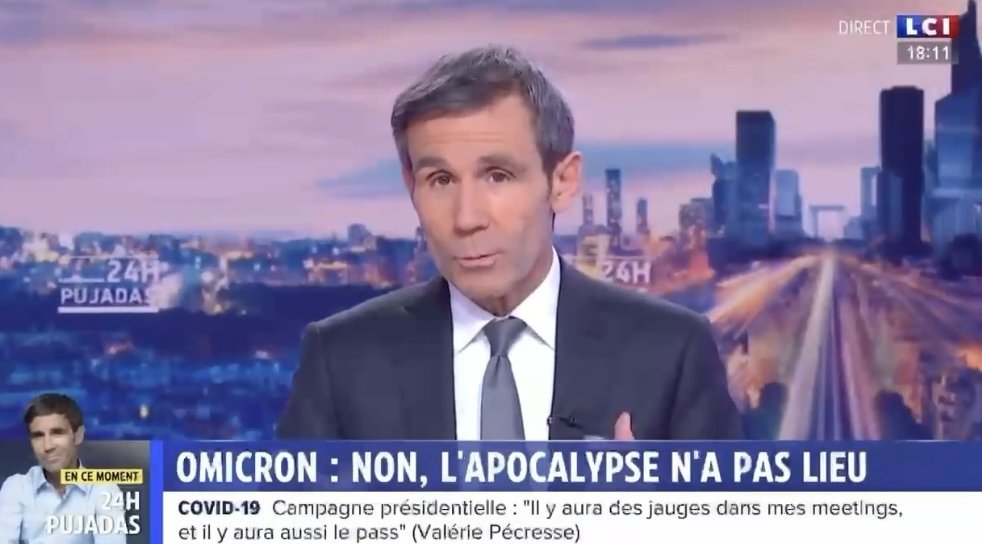 David Pujadas, célèbre présentateur, aujourd’hui sur LCI, a balancé un édito remarqué cette semaine sur la « fameuse vague Omicron ». Et il n’y est pas allé de main morte : corrosif, offensif, interrogateur sur la réalité sur la vague du nouveau variant à la mode et de la panique entretenue chez certains Français. De plus, le bandeau était clair : « Omicron, Non l’apocalypse n’a pas lieu ». Tout est dit !