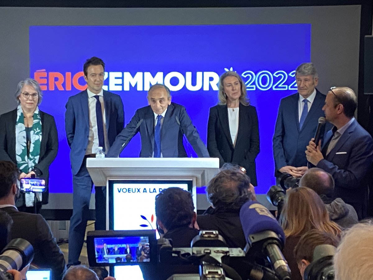Les soutiens du candidat étaient aussi présents. On y a vu Jacline Mouraud, ancienne figure des Gilets jaunes, Philippe de Villiers, ou encore le nouveau transfuge des Républicains, Guillaume Pelletier mais aussi Laurence Trochu, tous aux côté d’Eric Zemmour derrière son pupitre. Dans la salle, Antoine Diers et Benjamin Cauchy, notamment, s’étaient mêlés à la belle chambrée de journalistes, sans oublier les très jeunes visages de l’équipe de campagne, qui en arrière-plan, assuraient la logistique, le placement des journalistes et la distribution des micros pour les questions au candidat.
