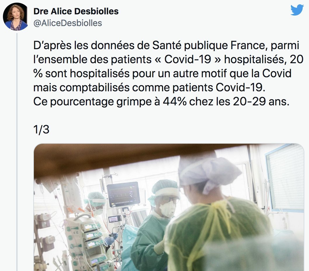 Alice Desbiolles annonce donc ce 15 janvier dans un tweet selon des informations de Santé Publique France que, « parmi l’ensemble des patients « Covid-19 » hospitalisés, 20 % sont hospitalisés pour un autre motif que la Covid mais comptabilisés comme patients Covid-19. Ce pourcentage grimpe à 44% chez les 20-29 ans (…) Il convient de distinguer les patients hospitalisés pour Covid et ceux hospitalisés avec un test positif au SARS-CoV-2 mais qui viennent pour autre chose (covid « accessoire »).