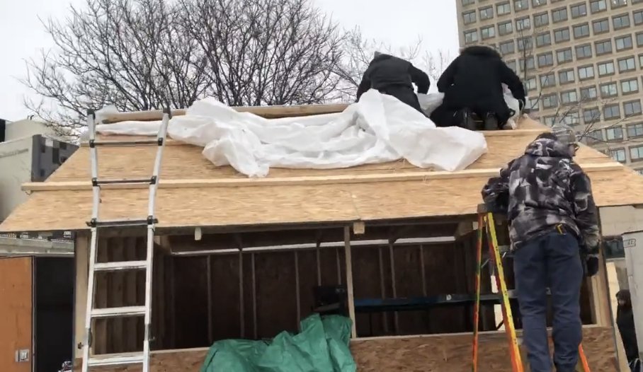En mode construction dans un point de ravitaillement devant l’hôtel de ville d’Ottawa. Les manifestants s’installent pour le long terme au centre-ville. pic.twitter.com/9sNuM8uYo9
