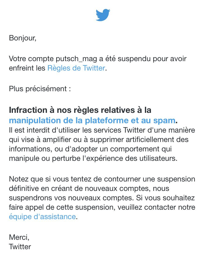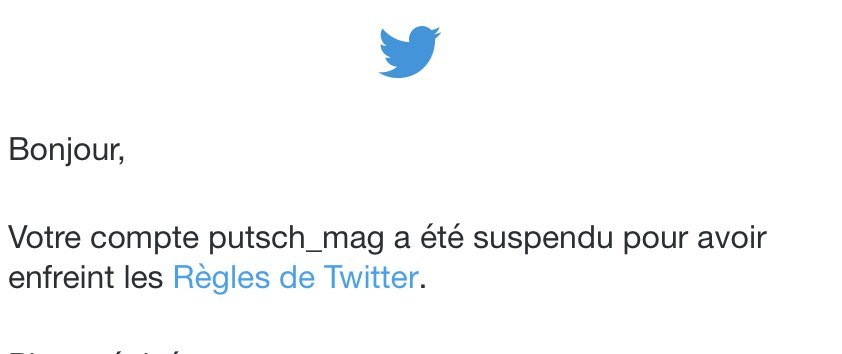 C’est par des emails totalement énigmatiques, que nous avons pris la suspension de nos comptes twitter ce vendredi soir. Après avoir connu récemment deux suppressions brutales d’interviews sur Youtube, il y a quelques semaines, c’est au tour de Twitter de s’attaquer à Putsch, avec ces deux « suspensions définitives » totalement abusives et profondément infondées.