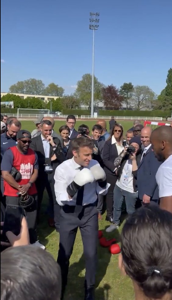 Et image insolite, Emmanuel Macron en bras de chemise a échangé quelques coups dans l’enceinte d’un complexe sportif dans une parodie de match de boxe avec un habitant. Il est temps que la campagne se termine.