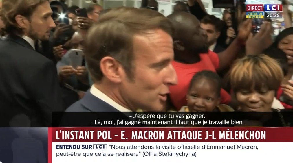 Une petite fille : « On va élire Mélenchon. Il est où? » à laquelle Emmanuel Macro répond : « Mélenchon, il est pas là ». Sur ce, la petite fille lance un « Moi je dégage » et disparait dans la foule alors que le Chef de l’Etat tente un « je veux pas qu’il gagne, moi, aux législatives, je ne pourrai pas faire les chose, c’est pour ça que je suis là moi, tu vois? ». Mais trop tard, la jeune fille avait déjà déguerpi.