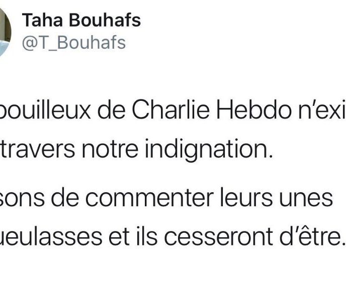 Taha Bouhafs, qui se définit lui-même sur son compte twitter comme « un journaliste des luttes » a publié un tweet pour le moins étrange ce 30 octobre sur son compte twitter où on peut y lire «  Les pouilleux de Charlie Hebdo n’existent qu’à travers notre indignation. Cession de commenter leurs unes dégueulasses et ils cesseront […]