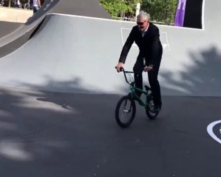 (Vidéo) Le maire de Montpellier, Philippe Saurel, juché sur un BMX en lunettes noires