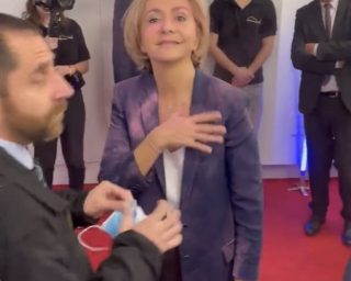 (Vidéo) Valérie Pécresse aspergée de poudre rose lors d’une allocution devant des représentants de PME